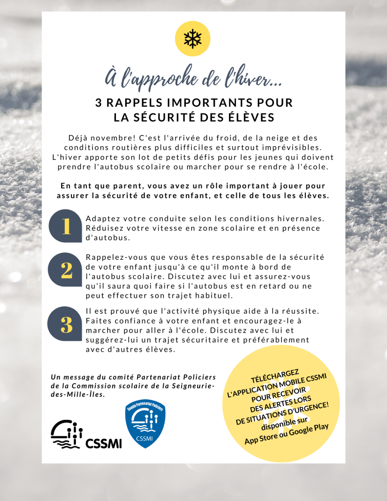 Chaque année, à l’approche de l’hiver, nous lançons un appel à la prudence pour les parents et les automobilistes afin de les sensibiliser