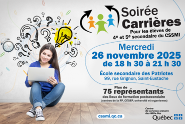 POUR QUI: Tous les parents et élèves de secondaire 4 et 5 du CSSMI C’EST BIENTÔT LA GRANDE SOIRÉE CARRIÈRES AU CSSMI !  Il s’agit d’un événement majeur où sont représentés plusieurs cégeps, centres de formation professionnelle, universités et autres organismes en lien avec le monde du travail. QUOI: Soirée carrières CSSMI  QUAND: Mercredi 26 novembre 2025, de […]